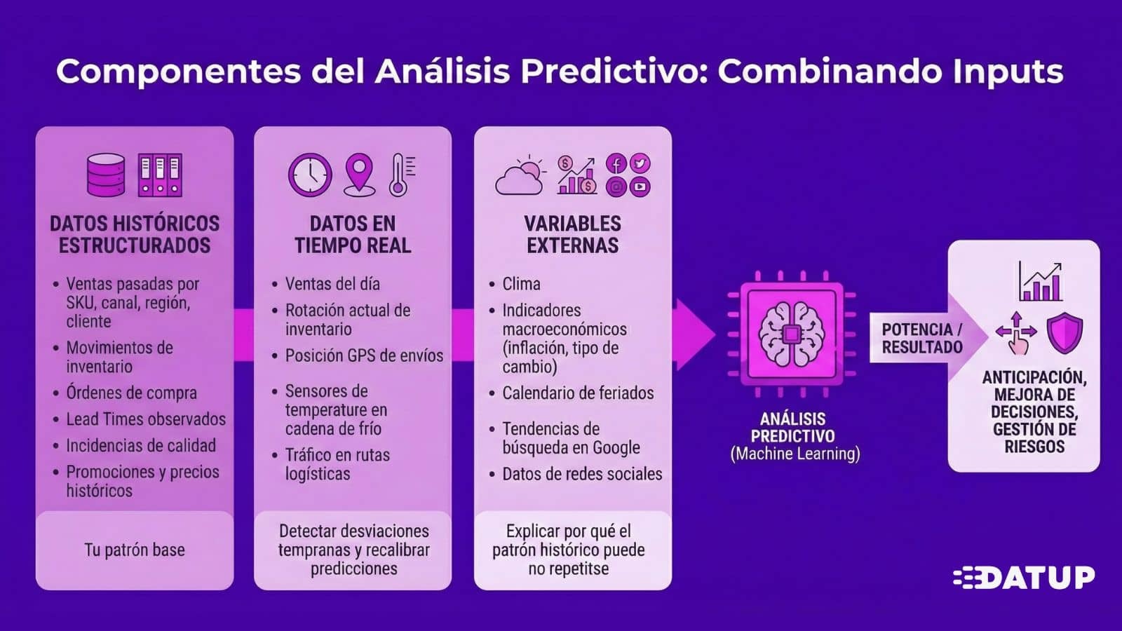 En Datup, trabajamos con modelos que incorporan variables externas automáticamente, pero también entregamos explicaciones claras de qué movió cada pronóstico, permitiendo que el planner valide con criterio antes de ejecutar.