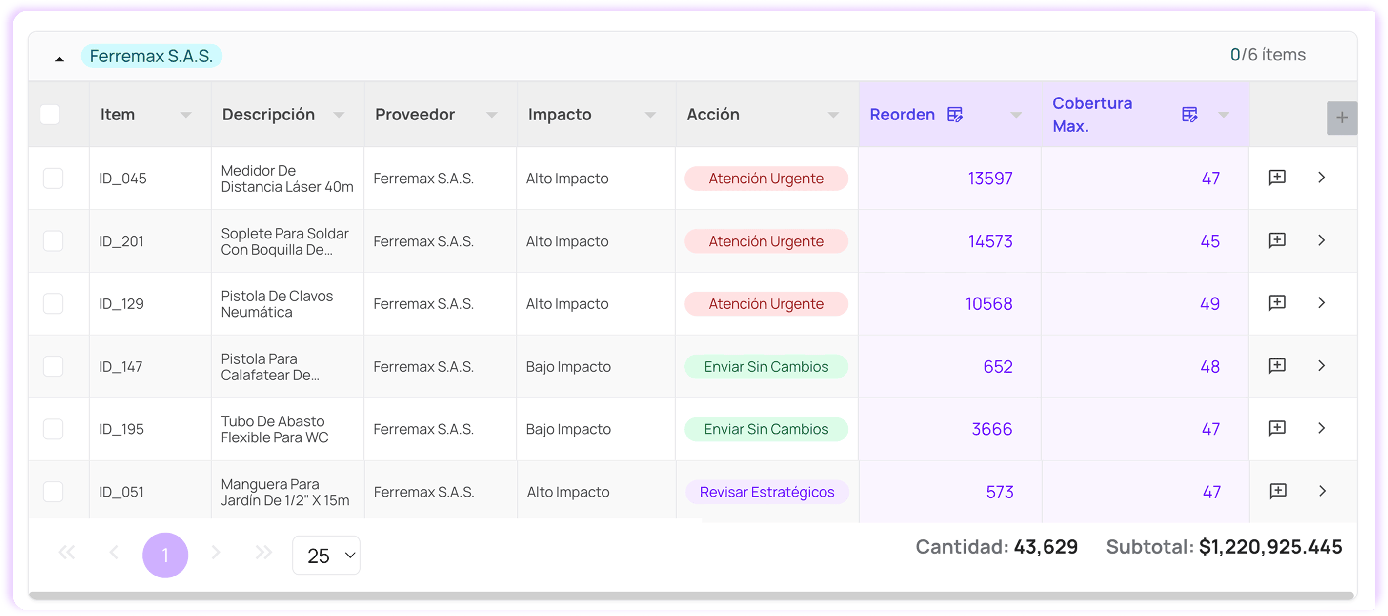 Optimiza tu inventario y define qué debes comprar y cuándo debes comprarlo.Calcula puntos de reorden, optimiza niveles de stock y sincronizar compras con la demanda real para reducir quiebres y excesos
