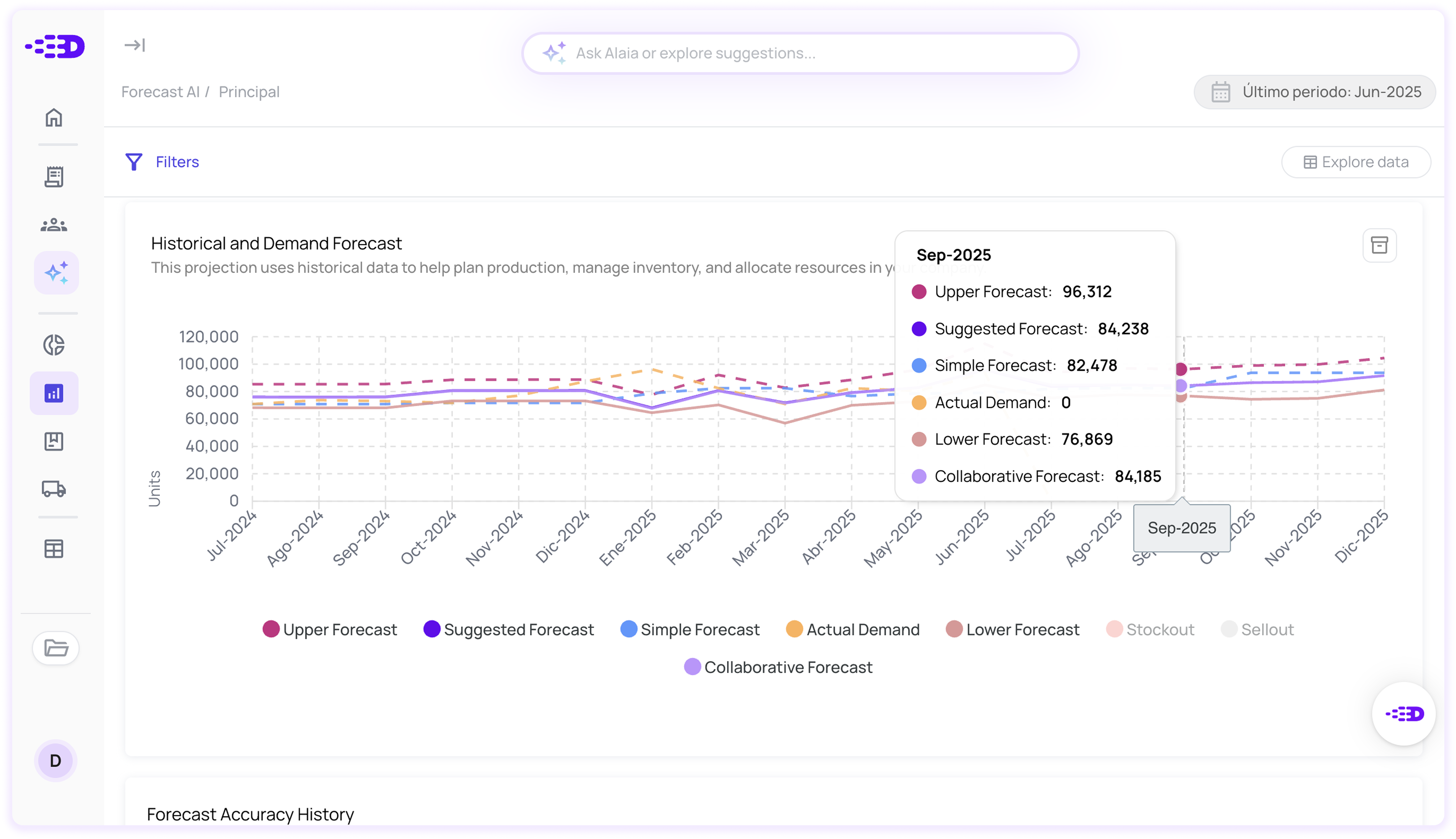 Pregunta por la demanda estimada de cualquier producto de tu portafolio, o el consolidado.Analiza diferentes escenarios, mientras colaboras con otros equipos.